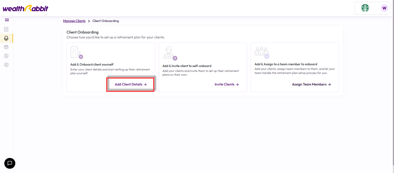 • Add & Onboard Client Yourself – By selecting this option, you need to enter all the required information for your clients manually and set up their retirement plan yourself.