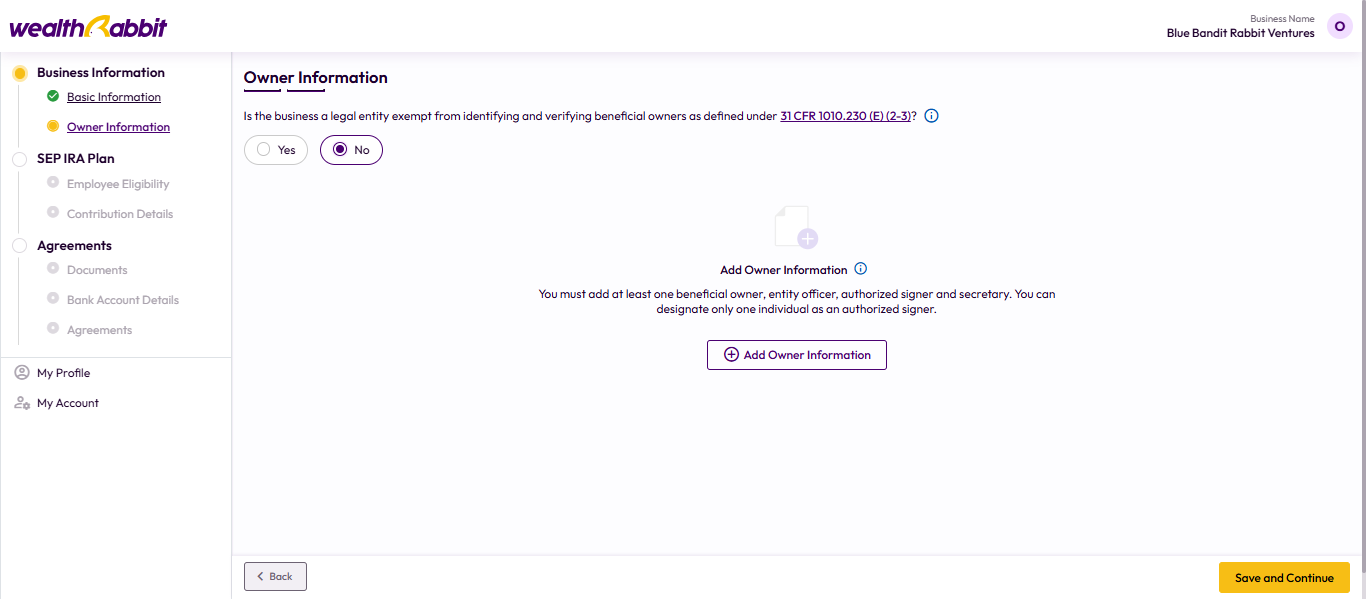 WealthRabbit provides a step-by-step, user-friendly platform to help you easily set up a SEP IRA plan for your partnership. Follow the steps below to complete the setup: