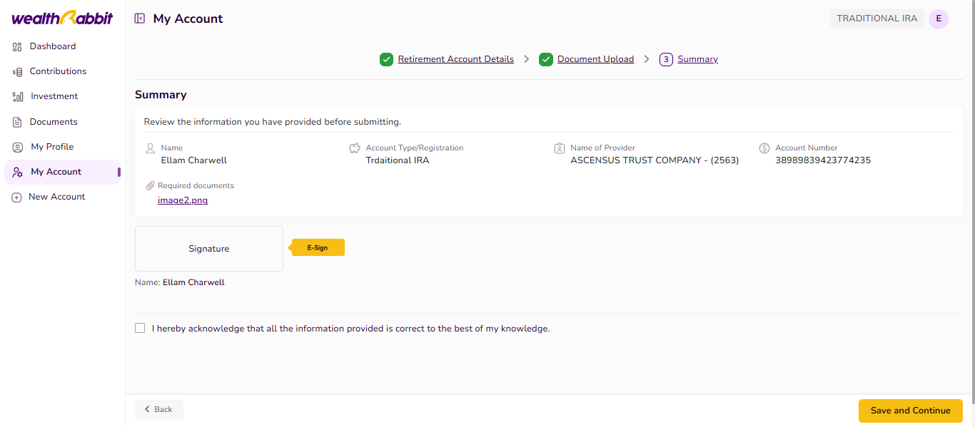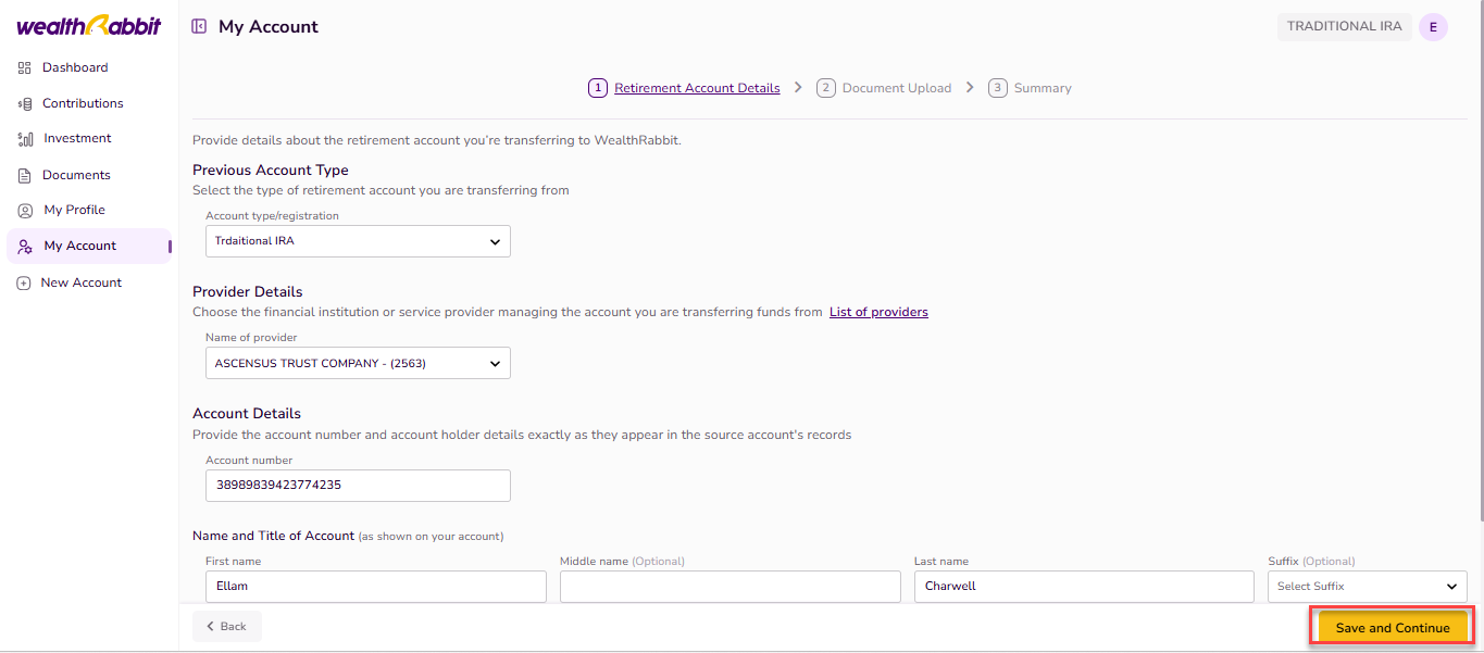 Step 4: Enter the details of your existing retirement account, including the previous account type, provider information, and account number, in the respective fields. Then click ‘Save and Continue’.