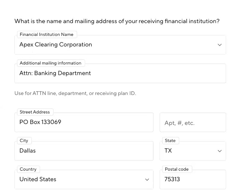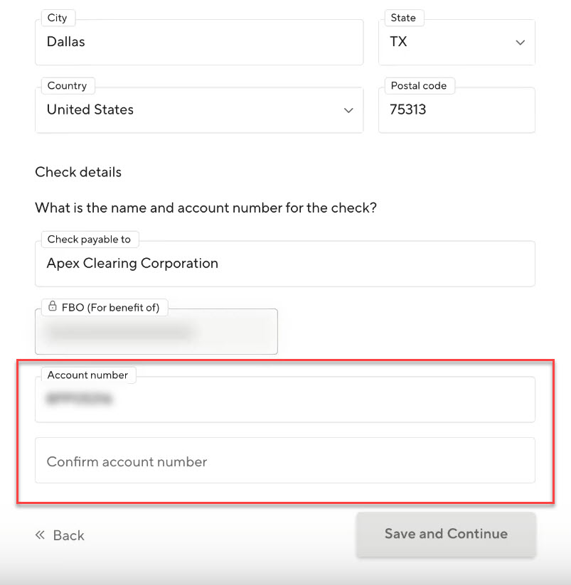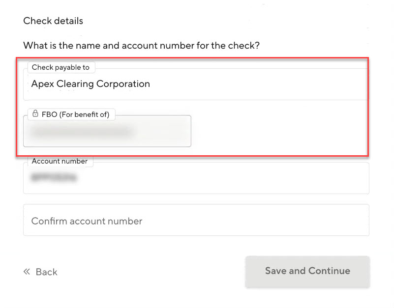 Step 8: Ensure the check is payable to ‘Apex Clearing Corporation’ with your name indicated as FBO (For Benefit Of).