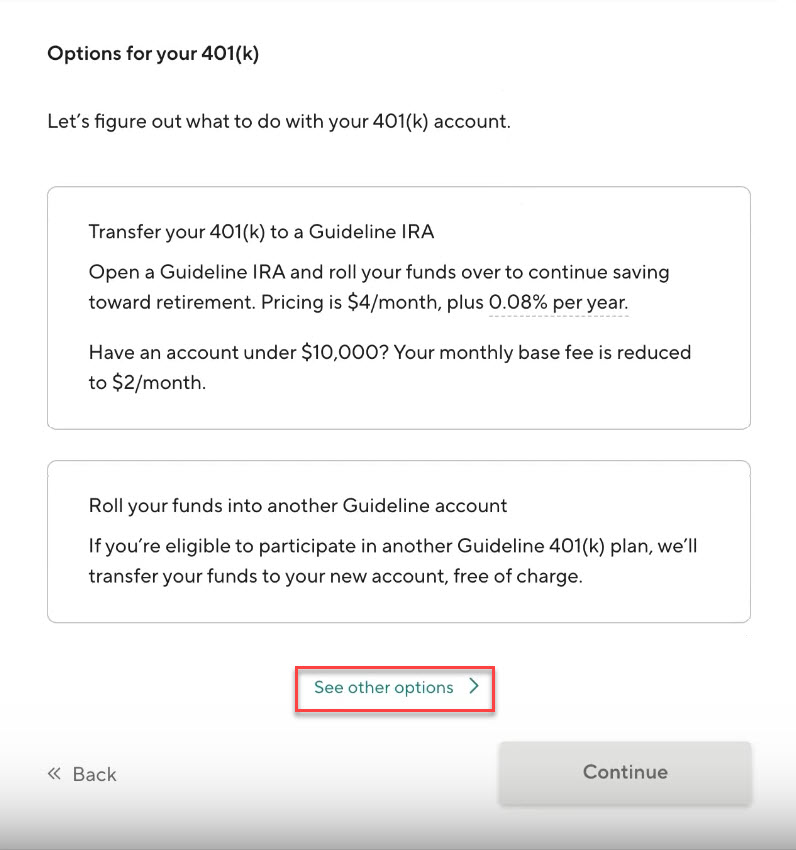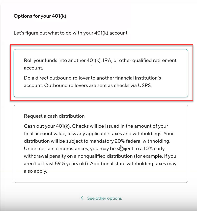 Step 4: Next, you will be prompted to choose how to use your 401(k) funds. Select ‘See other options.’